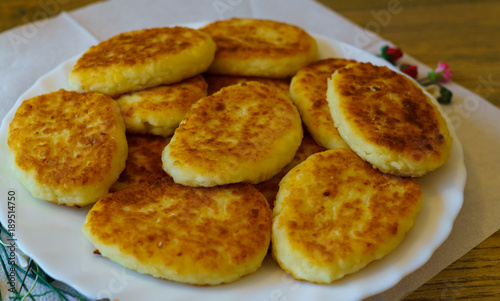 pancakes made of cottage cheese, made at home, on a plate.