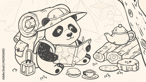 panda, bear, hat, backpack, map, camping, forest, tea, teapot, cup, lantern, log, tree, mushroom, tent, adventure, nature, outdoors, cartoon, cute