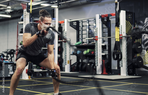 Pandemic gym - man working out with protective face mask during coronavirus outbreak