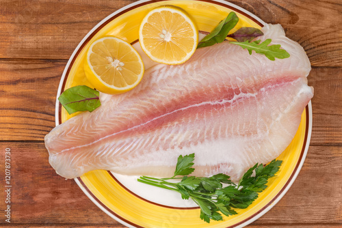 fish, freshwater fish, fillet, boneless, raw, food, product, frozen food, cookery, kitchen, cooking, fish dish, fishing, lemon, cut, half, herb, leaf, fresh, wooden, dish, yellow, rustic, table