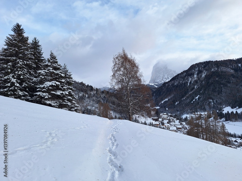 snow, italy, dolomite, city, town, skiing, topview, house, hotel, city landscape, winter, landscape, mountain, meadow, glade, tree, forest, sky, north, view, panorama, tour tourism, travel, horizontal, alps, walking, outside, surface, background, nobody, luxury home, culture, day