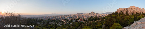 Panorama über das antike und moderne Athen bei Sonnenuntergang
