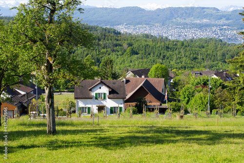 Panorama view from hill at City of Zurich over canton Zurich at springtime. Photo taken May 28th, 2021, Zurich, Switzerland.