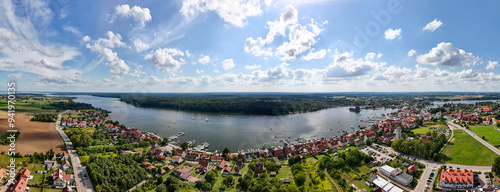 Panoramic aerial drone photo to Mikolajki townscape - capital of Masurian region. Mikolajskie lake.