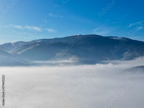 Panoramic aerial drone view on Grand Ballon Vosges mountains above the sea of clouds with a deep blue sky and a beautiful radiant sun, a fairy tale-like dreamy cotton bed at altitude