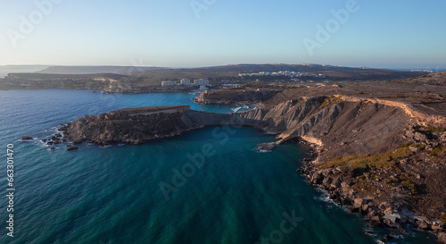 Panoramic aerial view of The Fourteen Soldiers Geological formation in Qarraba Bay, Mgarr, Malta.
