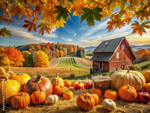 thanksgiving, autumn, fall, background, panoramic, landscape, harvest, leaf, nature, scenery, rural, farm, country, pumpkin, hay, tree, sky, gold, vibrant, colourful, rustic, field, season, october, november, holiday, celebration, gratitude, family, food, foliage, outdoors, photo, image, picture, illustration, design, texture, autumn