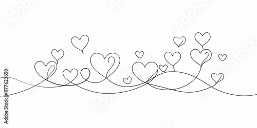 Panoramic Collection of Hand-Drawn One-Line Hearts: Valentine's Day Love Symbols, Continuous Line Art Sketches, Isolated on White