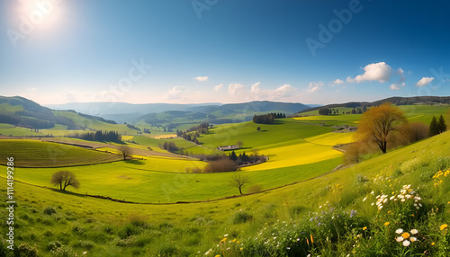 Panoramic countryside landscape under sunny sky, vibrant mood, serene nature view