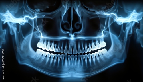 Panoramic dental X ray image shows full mouth teeth. Jaw bone structure visible. Medical diagnostic tool. Dentistry healthcare. Oral health check. Teeth care.
