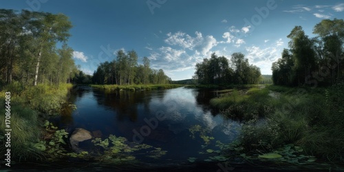 Panoramic hdri view of a serene river bend surrounded by lush trees in tranquil nature environment
