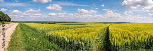 panoramic landscape, lush green wheat field, dirt path through fields, blue sky with fluffy white clouds, horizon line, idyllic rural scenery, agricultural landscape, peaceful countryside scene