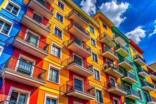 Panoramic Low Angle View of Building Facade with Balconies, Blue Sky