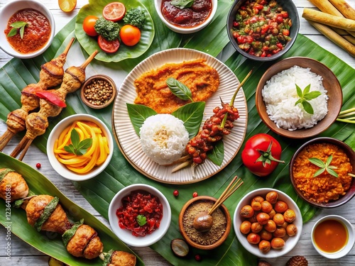 Panoramic Malaysian Food Flatlay: Nasi Lemak, Char Kway Teow, Satay & More