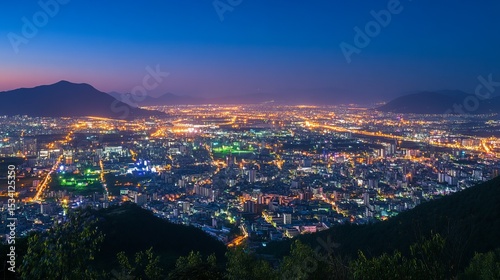 city, night, light, mountain, landscape, urban, panoramic, view, twilight, city landscape, sprawling, illuminated, huge, extensive, horizon, dusk, skyline, building, street, road, house, structure, development, growth, expansion, modern, contemporary, metropolitan, dense, populated, vibrant, energetic, dynamic, bright, colourful, dark, blue, purple, hill, vale, scenery, beauty, majestic