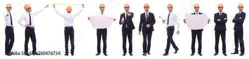 panoramic photo collage of confident architect isolated on white