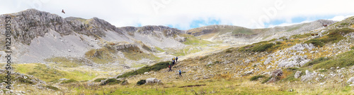 panoramic photo of a valley in Abruzzo, Italy. At the center, some hikers climb the valley, on the right and left some deer observe an eagle flies over the mountains.
