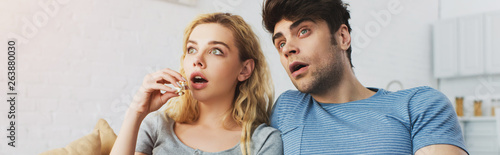 panoramic shot of shocked man watching movie near blonde girl holding popcorn
