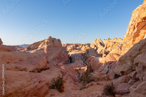 Panoramic sunrise view of arid landscape with striated red and white rock formations along the White Domes Hiking Trail in Valley of Fire State Park in Mojave desert, Overton, Nevada, USA. Road trip