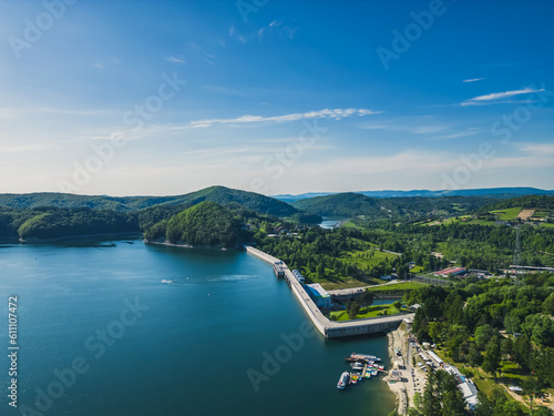 Panoramic view from the drone during sunset, on Lake Solina overlooking the modern gondola lift with a lookout tower over the Solina water dam, in the Polish Bieszczady Mountains, Poland
