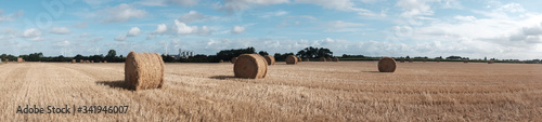 Panoramic view hay rolls in a French filed.