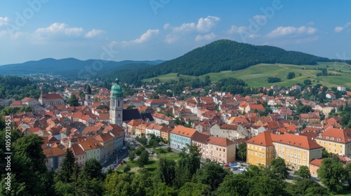 Panoramic view of a small European town nestled in a valley, with a church steeple and green hills in the background.