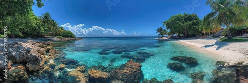 Panoramic view of a tropical beach with crystal-clear turquoise water, rocky shoreline, lush greenery, and palm trees under a sunny sky.
