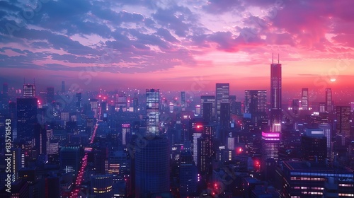 Panoramic view of a vibrant cityscape at dusk