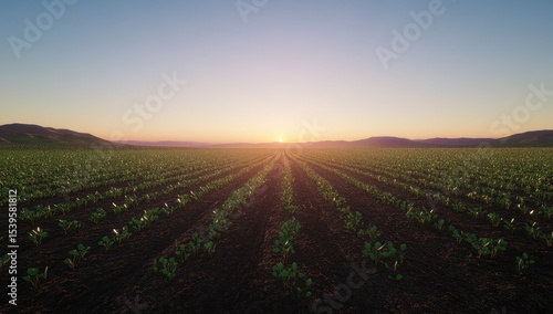 field, crop, sunset, sunrise, landscape, row, plant, growing, agriculture, rural, nature, horizon, mountain, sky, earth, dirtied, sun, light, gold, vibrant, lush, green, organic, farm, farming, cultivated, growth, abundance, beauty, scenic, peaceful, wide, perspective, digital, illustration, simulated, detailed, immaculate, honed, even, aligned, uniform, fresh, young, detail