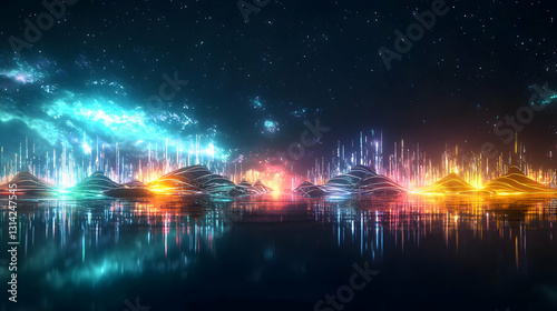 city, abstract, landscape, futuristic, light, neon, glowing, night, sky, star, water, digital, fantasy, glow, illuminated, modern, urban, colourful, electric, vibrant, spectacular, artistic, creative, imaginative, science fiction, space, galaxy, dreamlike, aethereal, mystical, magic, cosmic, surreal, fantasy art, abstract art, illustration, background, wallpaper, design, graphic, optical, shine, bright