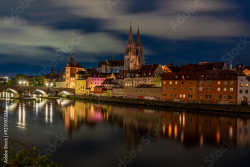regensburg, danube, river, long exposure, abstract, art, illuminated, night, people, people traveling, holiday maker, tour tourism, nightlife, dusk, lighting equipment, street light, light, glowing, color image, creativity, background, cloudscape, overcast, dramatic sky, cloud, water, city landscape, city, urban scene, architecture, stone bridge, bridge, cathedral, tower, clock-tower, st. peter, blue, sky, scenic, cloud, outdoors, landscape, built structure