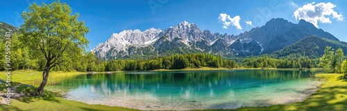 Panoramic view of the beautiful lake in summer, surrounded by forest and mountains with snow-capped peaks