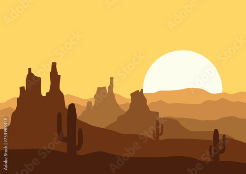 Panoramic view of the desert in America. Vector illustration in flat style.