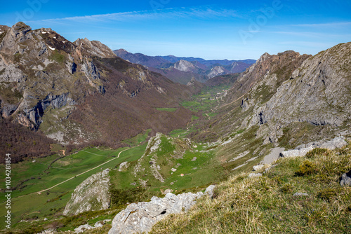 Panoramic view of the mountains of the Somiedo Natural Park in Asturias, Spain, with a spectacular view from the top in the middle of spring, snow on the peaks and grass in the valleys