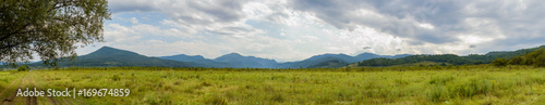 Panoramic view of valley in mountain landscape at the foot of the Caucasus Mountains, Adygea, Russia