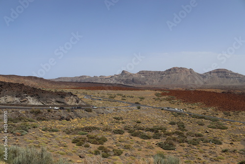 Panoramic view of volcanic lanscape in front of the ocean from the peak of mountain Teide, Tenerife