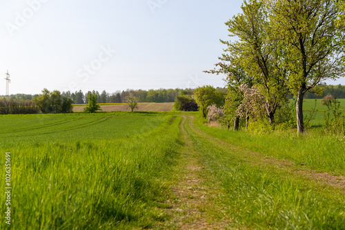 Panoramic view on a dirt road in September with corn, rapeseed, sugar beet and few trees