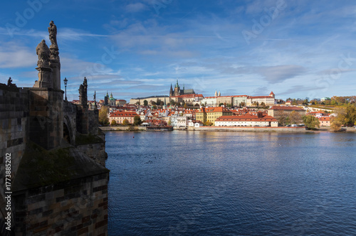 Panoramic view to city Prague with river Vltava, Charles bridge and castle