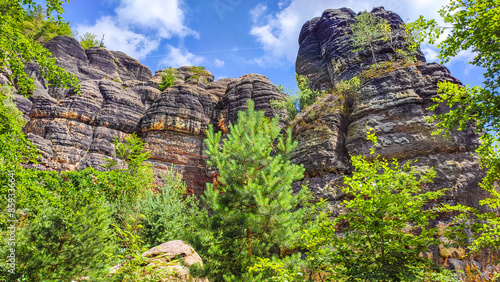 Panoramiv over hiking trail, ancient forest at Sandstone rocks Schrammstein group in the national park Saxon Switzerland, Bad Schandau, Saxony, Germany