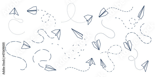 Paper airplane. Fly plane, flight dotted routes and line aircraft toy. Isolated abstract flying, travel or logistic trip. Conceptual aviation recent vector symbols