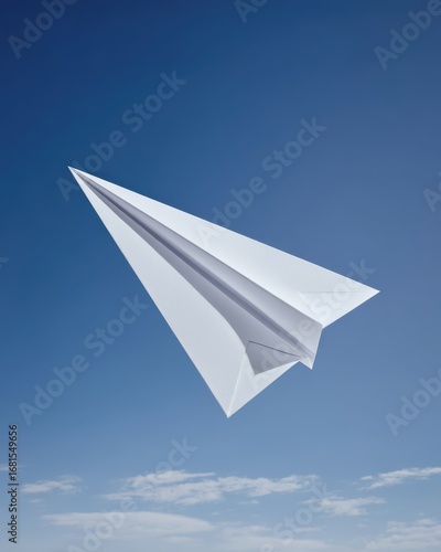 Paper airplane soars against a bright blue sky with wispy clouds low angle shot symbolizing freedom and imagination travel dreams