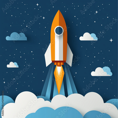 Paper art style of rocket flying in space, start-up concept, flat-style vector illustration.