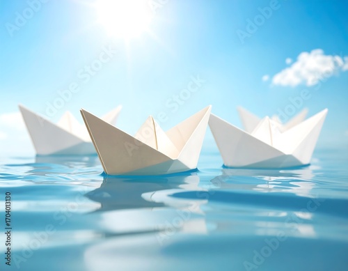 paper, boat, water, sky, bright, sun, cloud, white, origami, calm, peaceful, travel, journey, hope, dream, adventure, freedom, light, floating, summer, blue, nature, peace, beautiful, ideal, sea