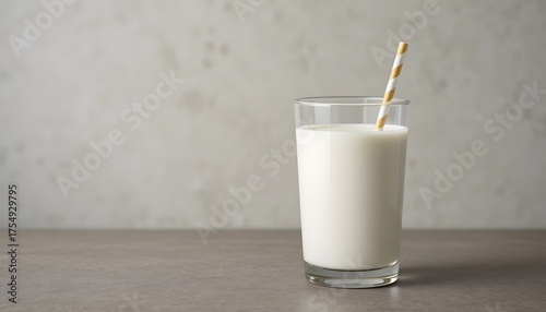 Paper straw standing upright in a glass of milk.
