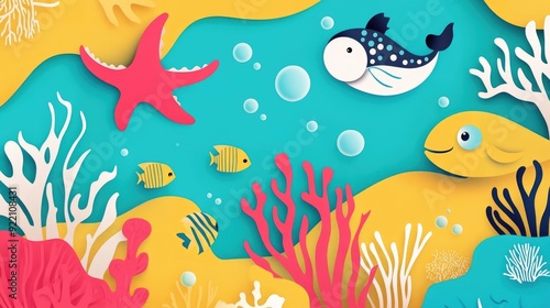 Papercut Playful Sea Creatures, Coral Reefs, and Enchanting Underwater Landscapes: Abstract Simple Minimal Joyful and Colorful 2D Layered Layout