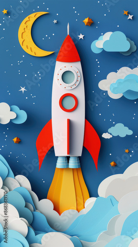 rocket, sky, cloud, star, blue, crescent moon, vivid colors, hi-res, fun, decoration, detailed, closeup, headlamp, space exploration, excitement, night, atmosphere, photo, colourful, playful, whimsical, dream, fantasy, illustration, art, design, night sky, celestial, adventure, space, journey, outer space, imagination, creativity, inspiration