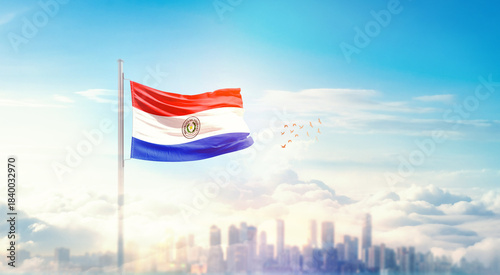 Paraguay flag wavering in beautiful clouds with building skyline. The flag with drone shot in beautiful sky. Paraguay national flag for independence day.