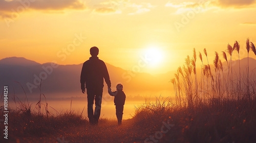 parent and elementary school student walk hand-in-hand, symbolizing love and support. The warm sunlight casts a gentle glow, highlighting their bond and the journey of learning and growth ahead