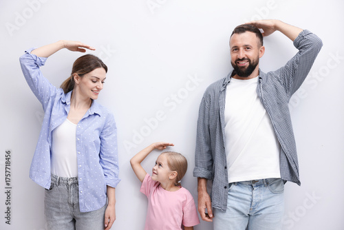 adorable, adult, background, care, casual attire, caucasian, check, children, childhood, clothes, compare, cute, daughter, development, family, father, female, fun, girl, grow, growing, growth, happy, health, height, height, high, home, indoor, children, length, little, male, man, measure, measuring, mother, motivation, people, primary, school, short, size, smiling, tall, taller, wall, white