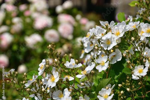 Paris, France. A white rose blooming in the Palais Royal Gardens. May 9, 2022.